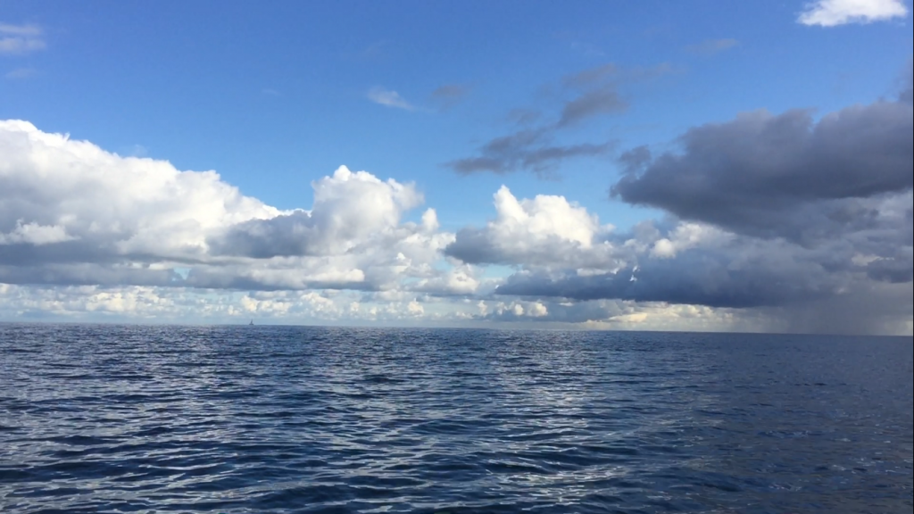 Vi la ut på formiddagen i delvis sol, delvis skyet. Fikk også en fin regnbue! Ikke mye vind til å begynne med, så det ble motor med storseilet oppe. Vi hadde kontakt over VHF og farten ble avpasset for å komme unna et par squalls.